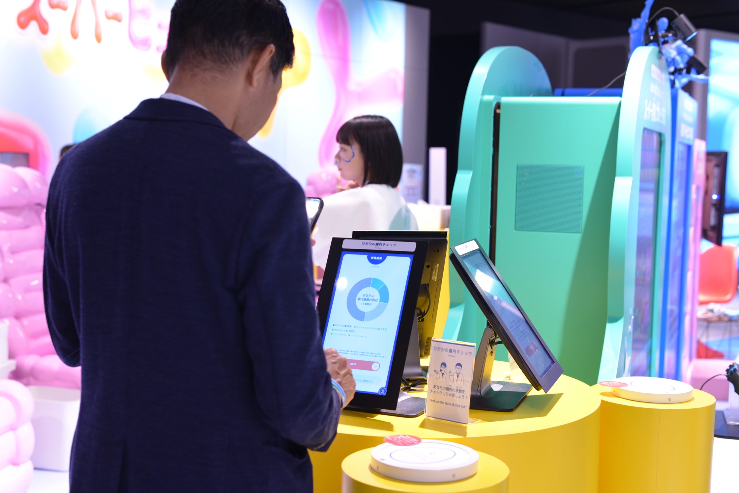 「ワタシの腸内チェック」は『リボーン体験』ルートの森永乳業様のブースで体験いただけます。必ずご予約の上、ご来場ください。
