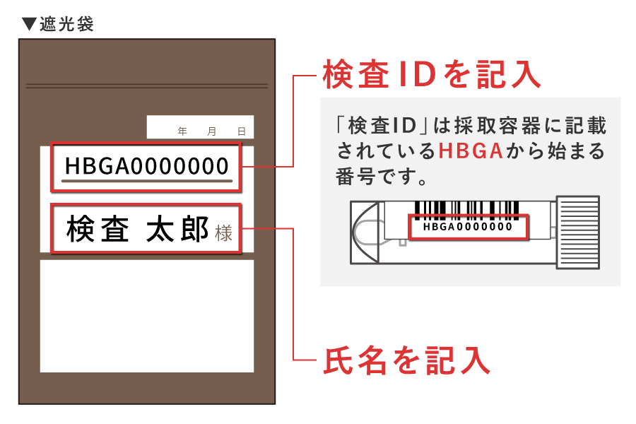 採便容器のフタをしっかりと閉めて、茶色の遮光袋に下記のイラストのように検査IDと氏名を記載してお送りください。